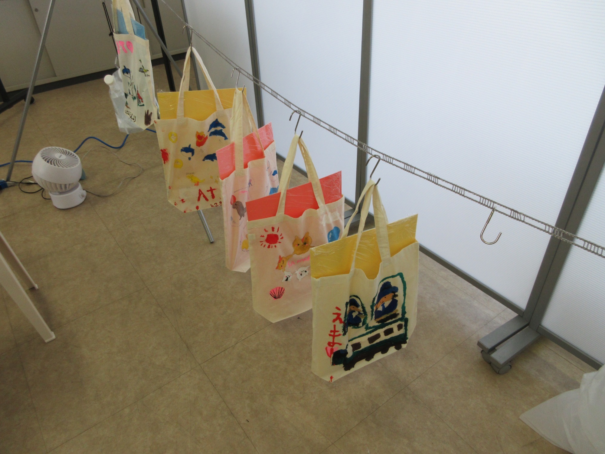 無地のトートバックに特別な絵の具を使いオリジナルのトートバックを制作していただき、個性あふれたトートバックが完成しました。
