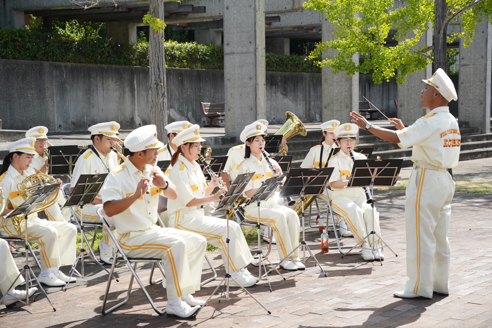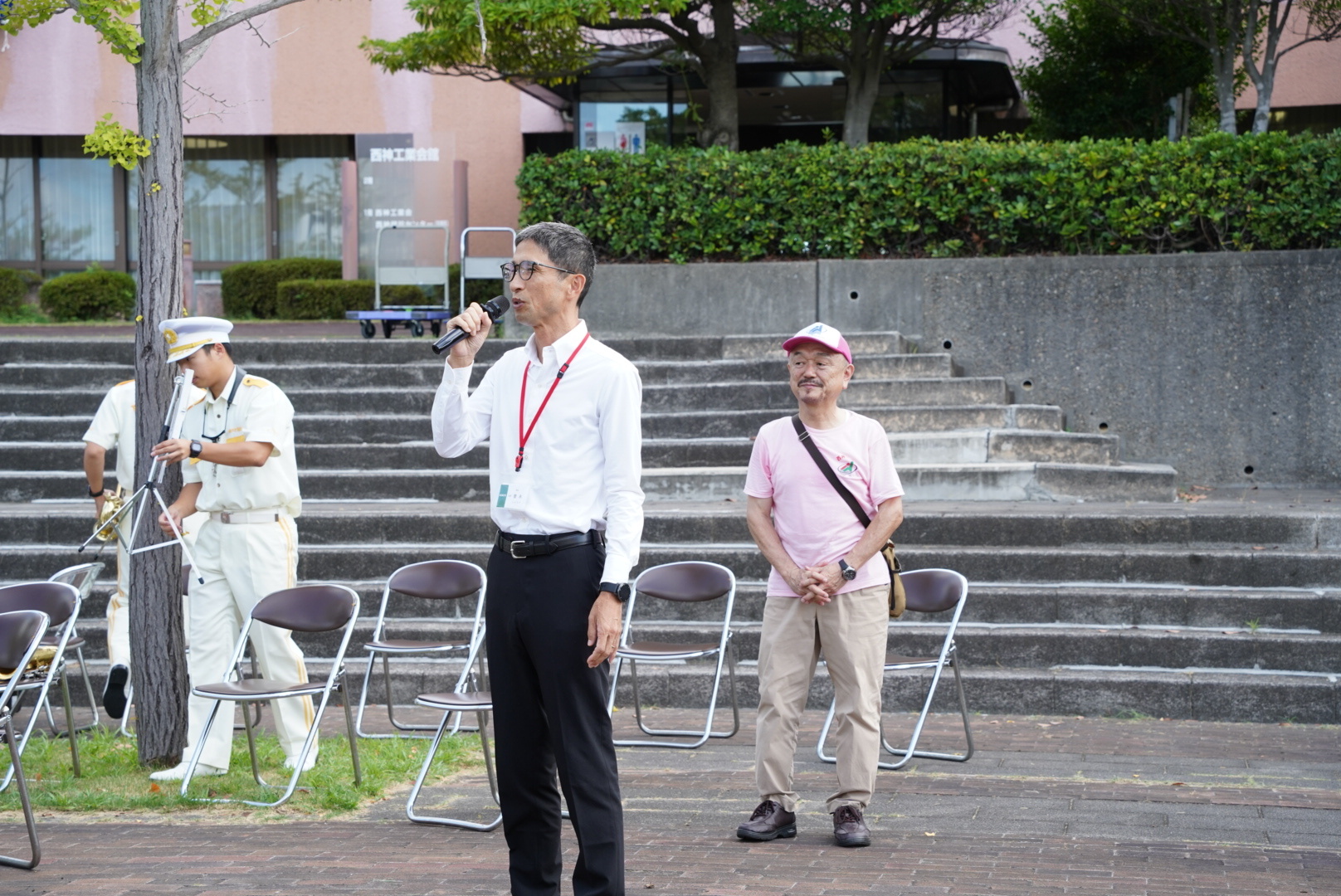 開会宣言の後、上田勇次 西神工業会会長の挨拶に続き、神戸市西区長 豊永太郎氏の来賓ご挨拶のあと、神戸市消防音楽隊によるミニコンサートが始まりました。アニメソングや映画音楽を中心に演奏していただき、途中、防災に関する広報も織り交ぜながら、20分あまりの素晴らしいパフォーマンスに参加者の手拍子も加わり、イベントに華を添えていただきました。