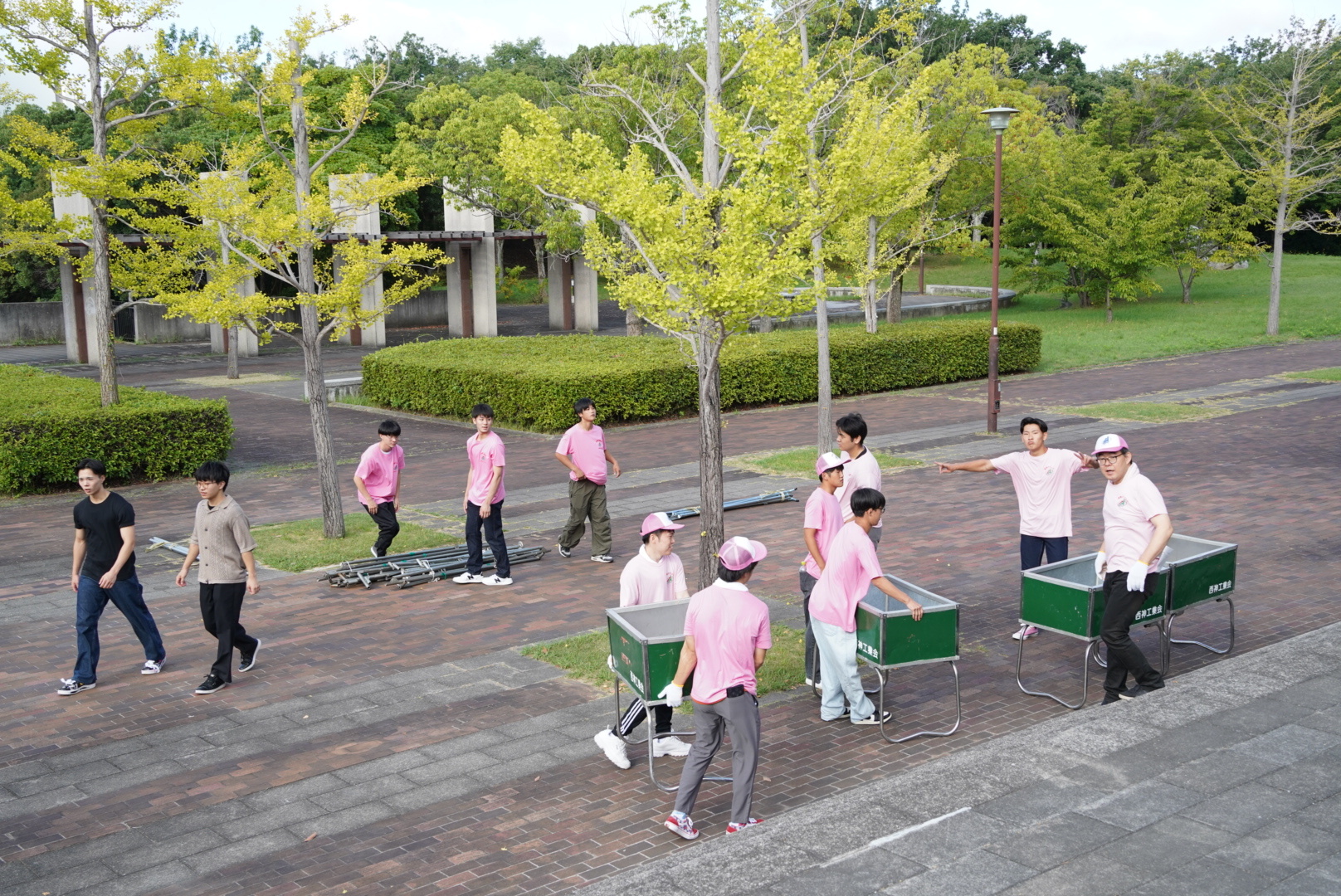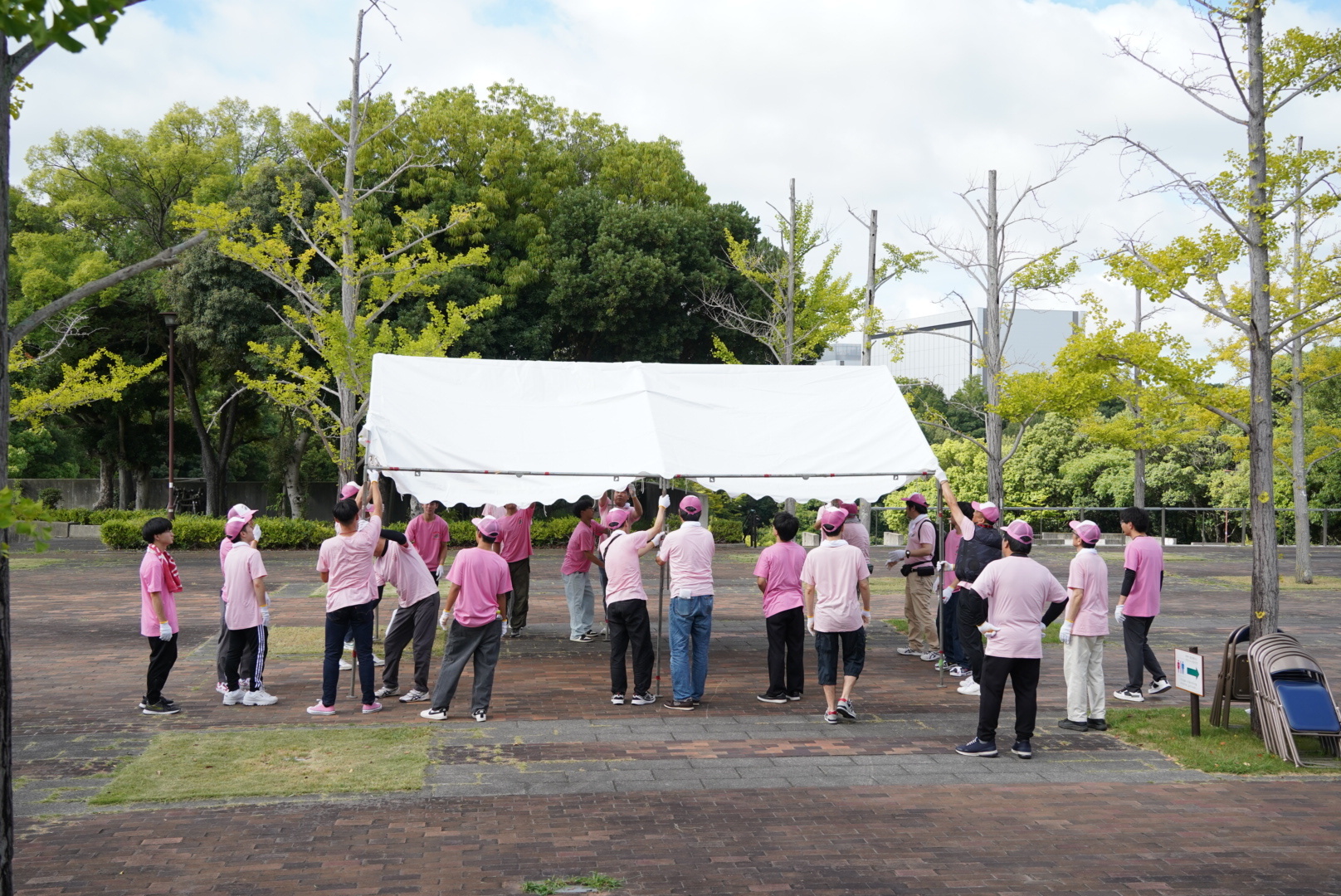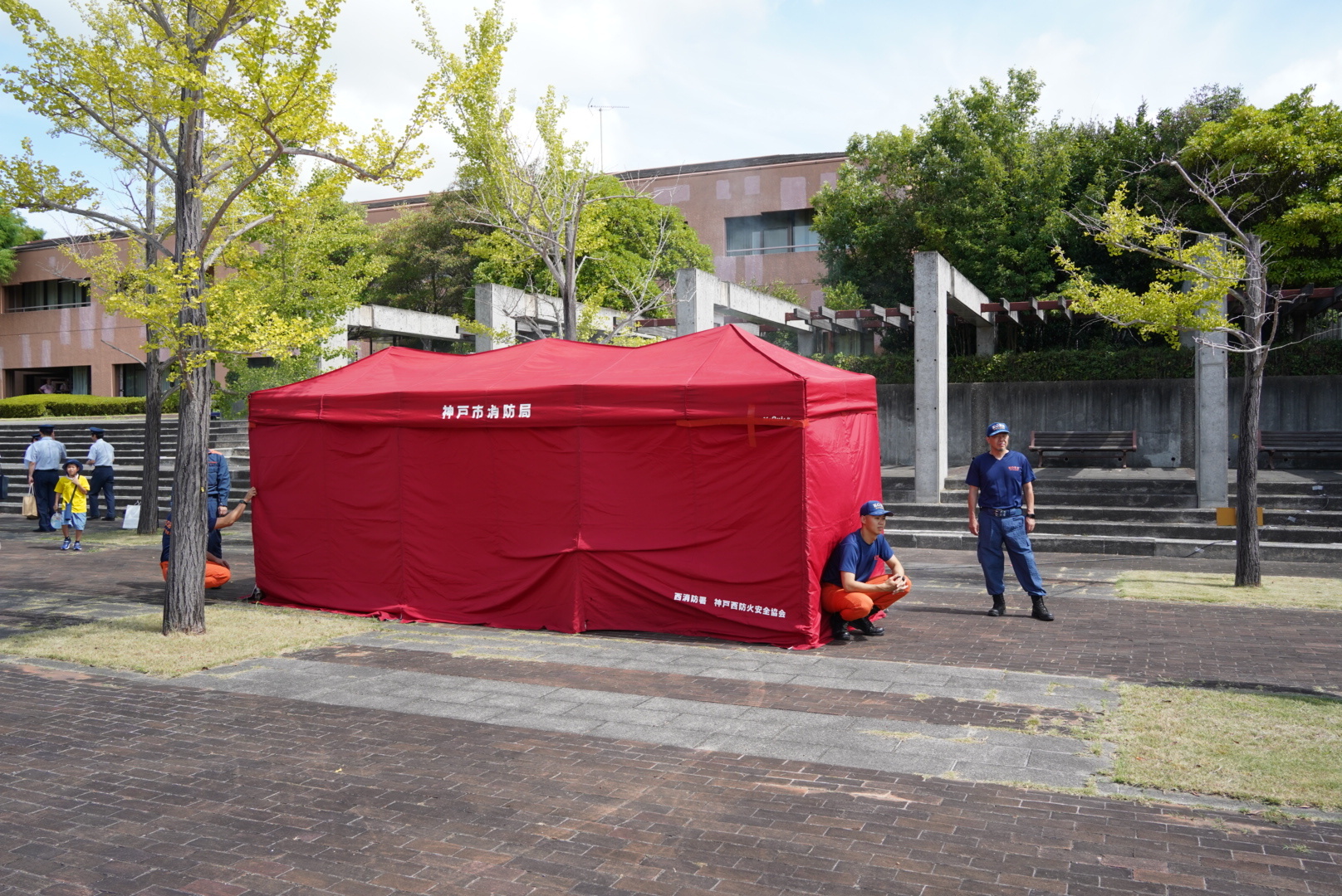 今年の夏は過去最高の暑さであったとのことで、当日も朝から蒸し暑いスタートとなりました。実行委員、ボランティアスタッフが、9時過ぎの開会に向けテントやテーブルなどの設営に汗を流し、同時に神戸西消防署の隊員の方々もポンプ車や地震体験車(ゆれるん)の設置で準備を進めてもらいました。